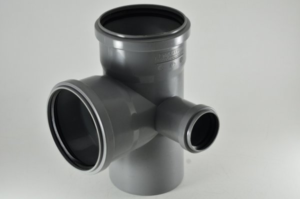 Крестовина двухплоскостная правая канализационная используется для монтажа двух ответвлений от основных канализационных стояков, транспортирующих хозяйственно-фекальные стоки внутри жилых, административных, производственных зданий.