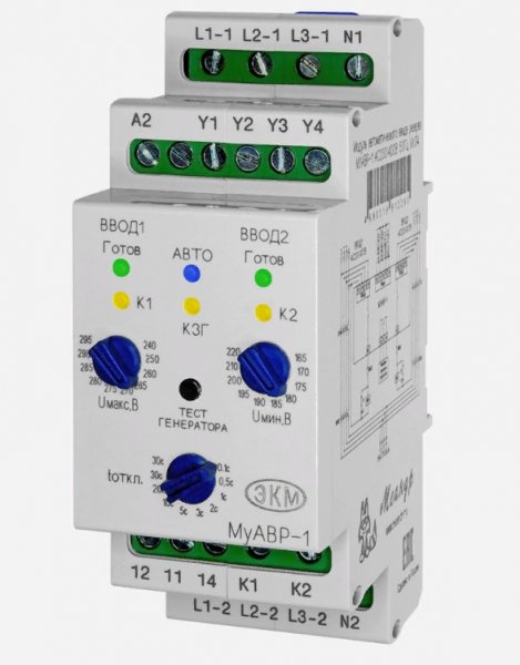 Модуль управления автоматического ввода резерва МуАВР-1 (далее Устройство) предназначен для автоматического переключения нагрузки на резервную линию, при отключении или возникновении аварийных ситуаций на основной рабочей линии. Устройство предназначено для использования в системах электроснабжения в однофазных и трехфазных четырехпроводных сетях (трехфазных сетях с нейтралью) для обеспечения энергоснабжения I и II категории подключения.