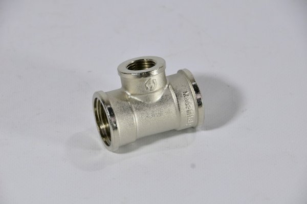 Латунный никелированный трехсторонний фитинг, равнопроходной. Резьба – внутренняя, цилиндрическая трубная по ГОСТу 6357 (ISO 228, EN 10226), совместимая также с наружной конической трубной резьбой по ГОСТу 6211 (ISO R7). Интернет-магазин www.td-viko74.ru