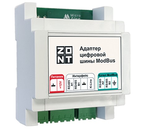 Адаптер цифровой шины Modbus (RTU) предназначен для подключения термостатов и контроллеров ZONT к котлам, поддерживающим одноименный цифровой протокол.