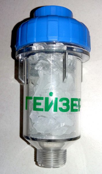 Фильтрующий элемент – гранулы полифосфата и силиката, позволяющие предотвратить образование отложений / накипи. Использовать только для технического умягчения воды.