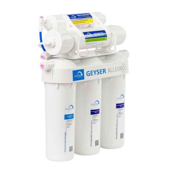 Технология обратного осмоса, использованная в фильтре Гейзер Аллегро, заключается в фильтровании воды через полупроницаемую мембрану. Размеры пор мембраны настолько малы, что пропускают только молекулы воды. Размер молекул большинства примесей, а также бактерий и вирусов значительно больше молекул воды, поэтому они не проходят через мембрану. Система работает при давлении в подводящей магистрали не менее 3 атм.